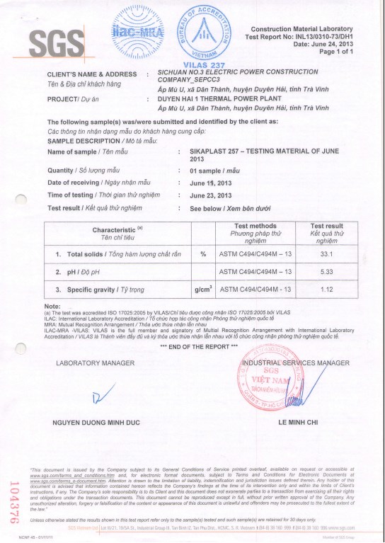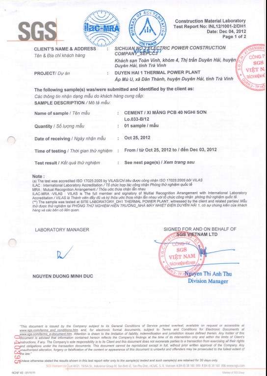 Kết quả thí nghiệm vật liệu thô - Nhà máy nhiệt điện Duyên Hải I